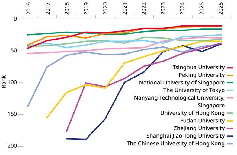 - 아시아 최상위권 대학들은 14년 만에 성장이 정체되었습니다.