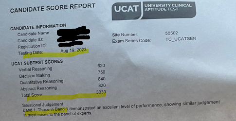 무려 3030 점에 SJT Band1 이라는 놀라운 결과를 얻었답니다. - UCAT 성적표