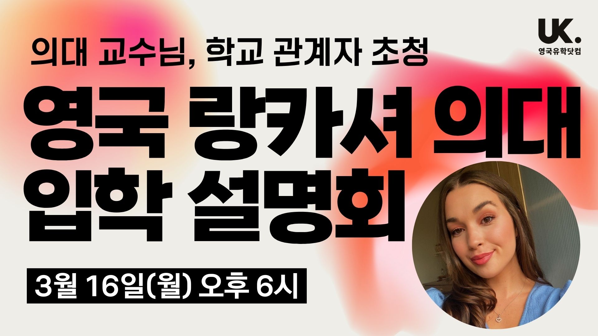 [3/16 영국 의대 설명회 공지] 9개월 파운데이션으로 영국 랑카셔 의대(UCLan) 입학하기 🩺🇬🇧 안녕하세요! 1990년 설립, 대한민국 1호 영국 전문 유학원…
