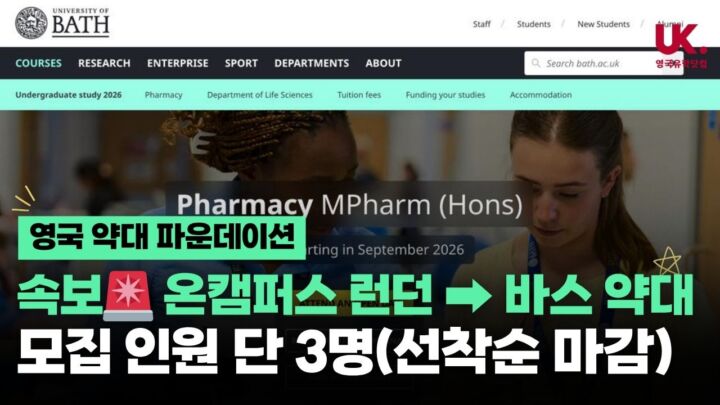 [긴급 공지] 2027년 바스 약대, 온캠퍼스 런던에서 단 3명! (선착순 마감) 안녕하세요, 1990년부터 영국 유학의 가장 정확한 길을 안내해 온 ‘우리나라…